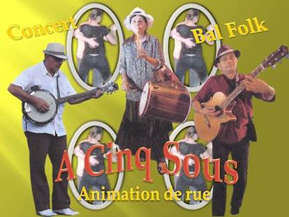 Groupe de musique festive d'inspiration traditionnelle pour animer vos fêtes, marchés et foires. A Cinq Sous propose un répertoire festif et dansant, de musiques traditionnelles venues de divers horizons et associe les instruments folkloriques provençaux (Galoubet Tambourin) au Banjo et à la Guitare. Le trio joue en déambulation pour l'animation de rue de vos fêtes de village de la région PACA et Occitanie. A cinq Sous peut animer un bal folk (balèti en provençal) ou se produire en concert sur scène. Une animation musicale de rue, festive et entrainante, une alternative aux animations proposées par une fanfare, une batucada ou un groupe folklorique!